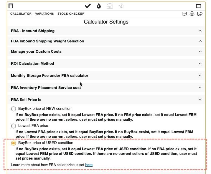 Calculator: Added under "FBA Sell Price", add 3rd option to assign FBA Sell Price by Buy Box price of USED condition.